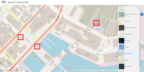 Depending on the application, you may prefer to use the OpenStreetMap basemap – this basemap shows additional points of interest including existing EV Chargers and Car Parks, as shown below.