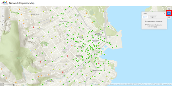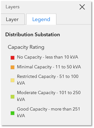 On the map, the Distribution Substation symbol is coloured by percentage of distribution substation load capacity estimated to be available.