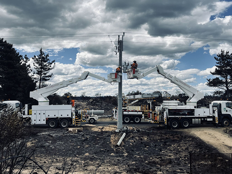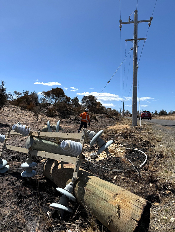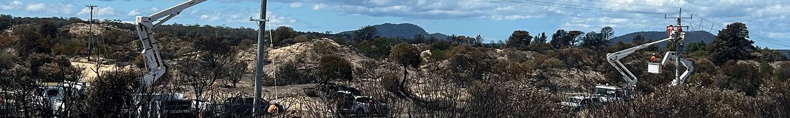Once access was possible, crews encountered extensive damage to the electricity network. Over 50 power poles had been destroyed or severely damaged, with sections requiring full rebuilds rather than simple repairs. Burnt poles, tangled conductors and unstable ground conditions required careful assessment at every step.