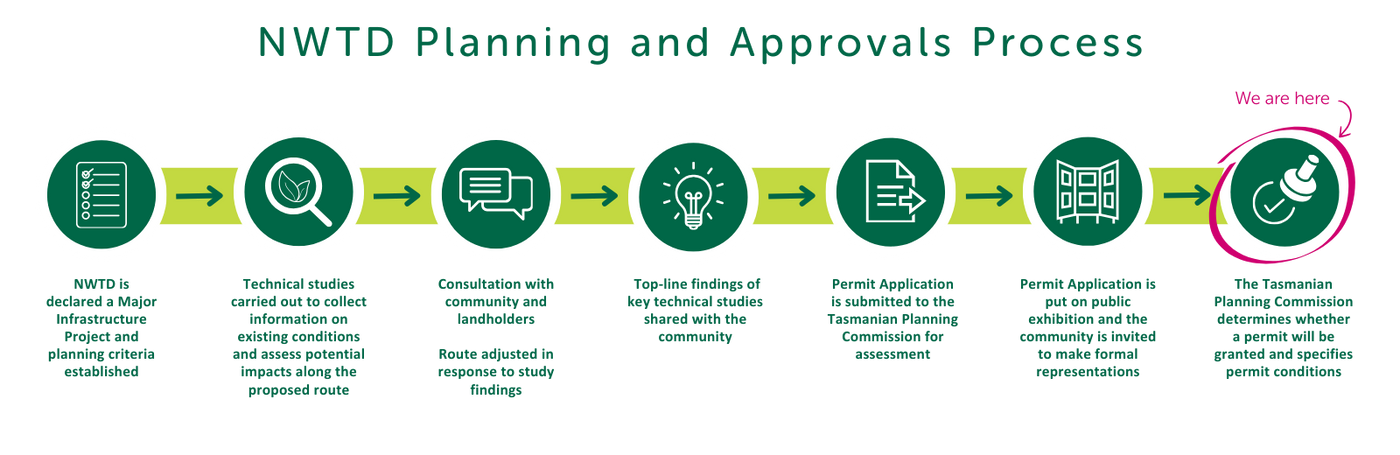 As part of the environment, planning and heritage approvals process, TasNetworks has lodged a permit application with the Tasmanian Planning Commission (TPC), the responsible planning authority under the Major Infrastructure Development Approvals Act 1999 (MIDAA). This is an important step that allows NWTD to be formally assessed before TasNetworks can proceed to the construction phase.