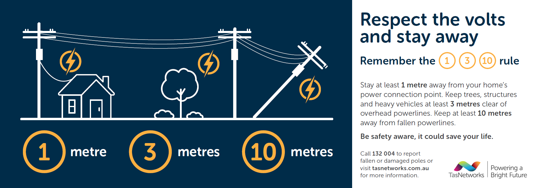 Keep trees and heavy vehicles at least 3 metres from powerlines